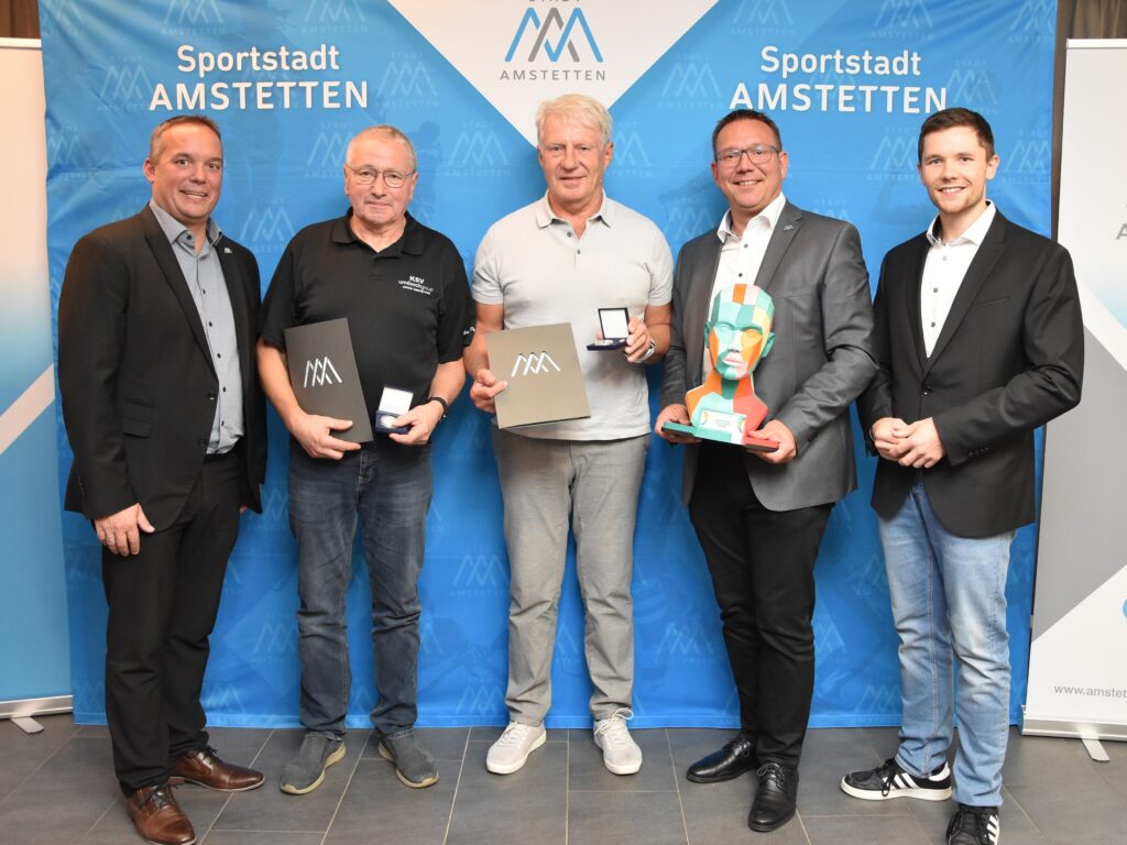 Bild: Sportstadtrat Gerhard Irxenmayer, Erich Datzberger, Josef Roucka, Bürgermeister Christian Haberhauer, Sportgemeinderat Andreas Fröhlich,